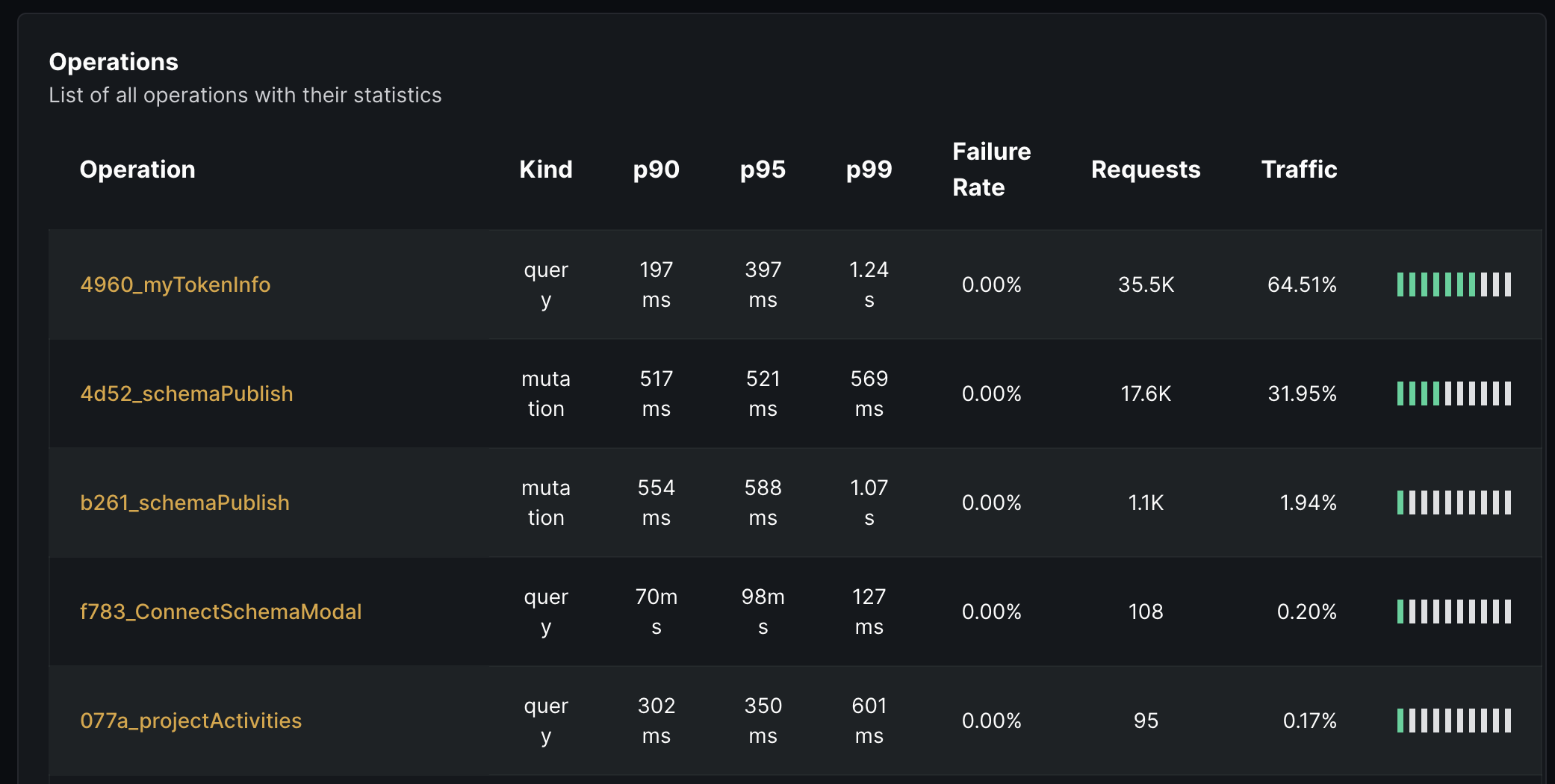 - Monitoring and Observability: view a list of all your GraphQL operations and their performance, error-rate, and other metrics.
